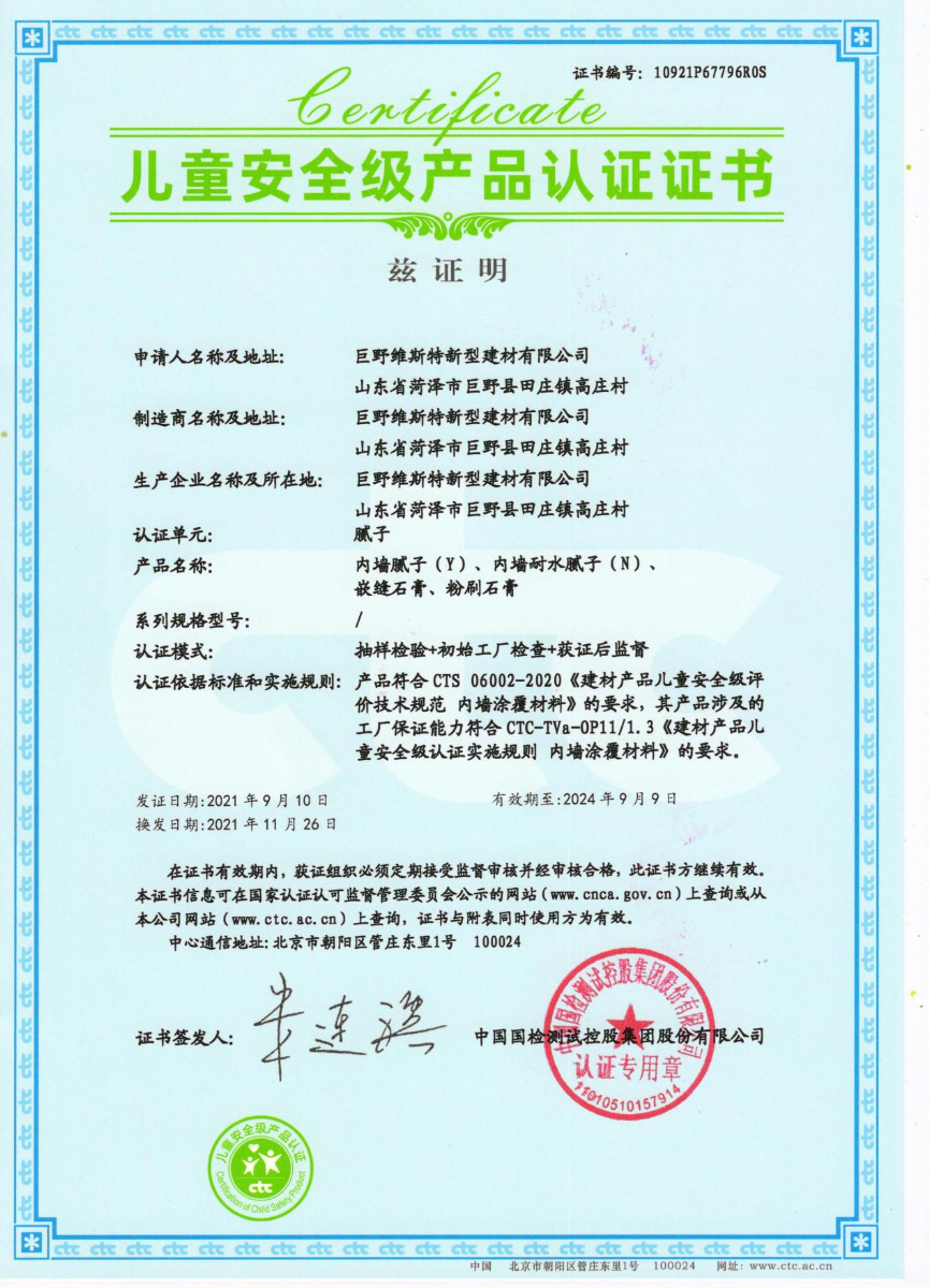 該系列通過中國建材中心頒發(fā)的“兒童安全級(jí)認(rèn)證證書”。(該證書是行業(yè)內(nèi)第二個(gè)榮獲兒童安全認(rèn)證產(chǎn)品),voc(揮發(fā)性有機(jī)化合物)、甲醛甲苯以及重金屬含量檢測標(biāo)準(zhǔn)要更加嚴(yán)格,產(chǎn)品符合《建材產(chǎn)品兒童安全級(jí)評價(jià)技術(shù)規(guī)范 內(nèi)墻涂覆材料》要求。